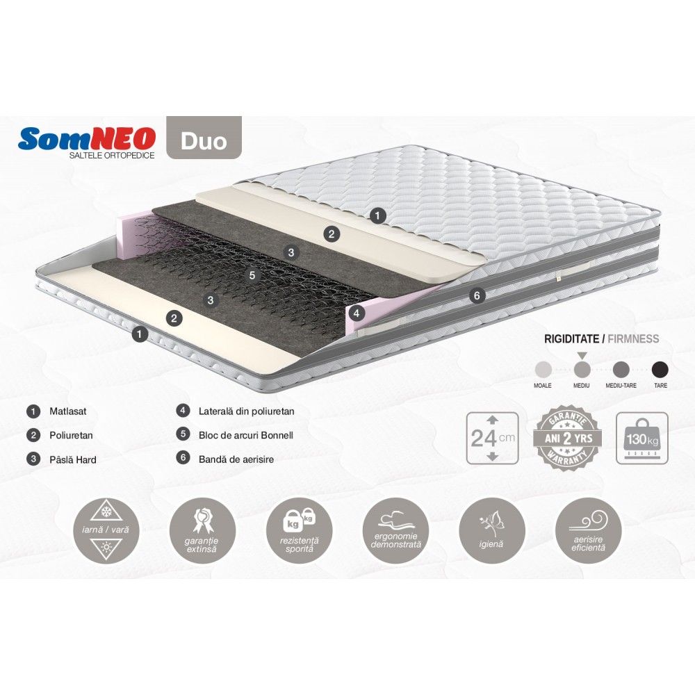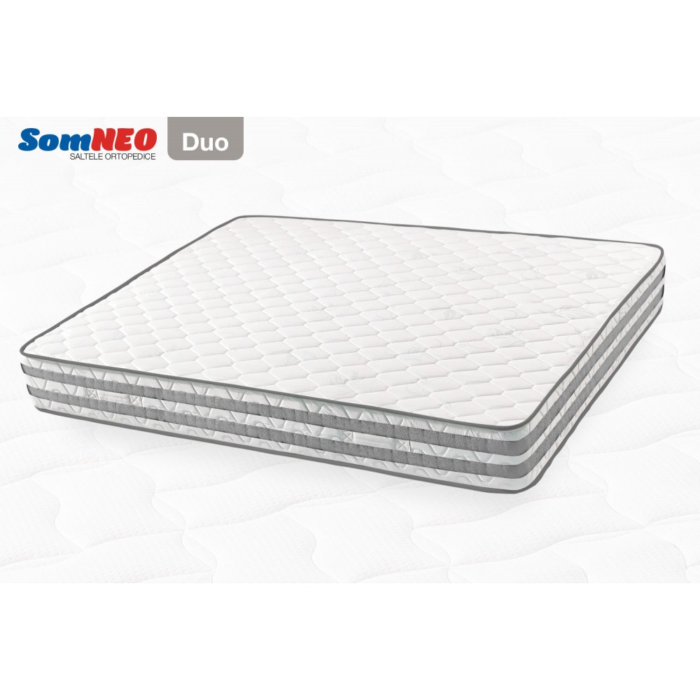 Salteaua Duo - o îmbinare perfectă a proprietăţilor de confort sporit cu cele de accesibilitate financiară. Dotată cu sistem de Iarna/Vara care permite alegerea nivelului de confort: fata de iarna, datorită unui strat de poliuretan mai dens oferă o susţinere mai bună, dar şi un grad mai înalt de păstrare a căldurii, comparativ cu fata de vara, care este mai poroasă, dar mai rigidă. Salteaua respiră prin 2 benzi de aerisire dispuse lateral şi este acoperită cu o husă din tesatura de tip Knitted, plăcută la atingere.