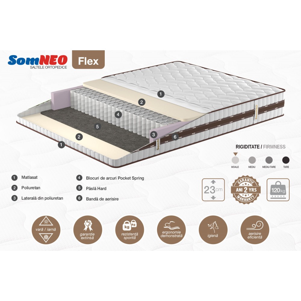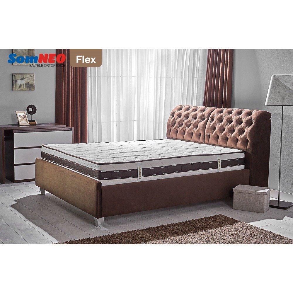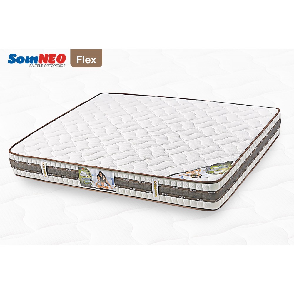 Salteaua SOMNEO FLEX este dotata cu arcuri de tip Pocket Spring impachetate in buzunare individuale, fapt care le permite sa se miste independent. Astfel, daca salteaua este folosita de 2 persoane concomitent, aceasta tehnologie permite transmiterea miscarii doar pe zona ocupata de persoana respectiva . Porozitatea mare a stofei exterioare de tip Knitted (tratata antibacterian) asigura o circulatie mult mai intensa a aerului, astfel facilitind eliminarea umeditatii.